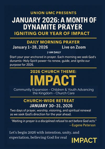 January will culminate in our Union Church-Wide Retreat (January 30 & 31). This retreat will help us discern how God is calling Union to make IMPACT in 2026—spiritually, relationally, financially, and missionally.